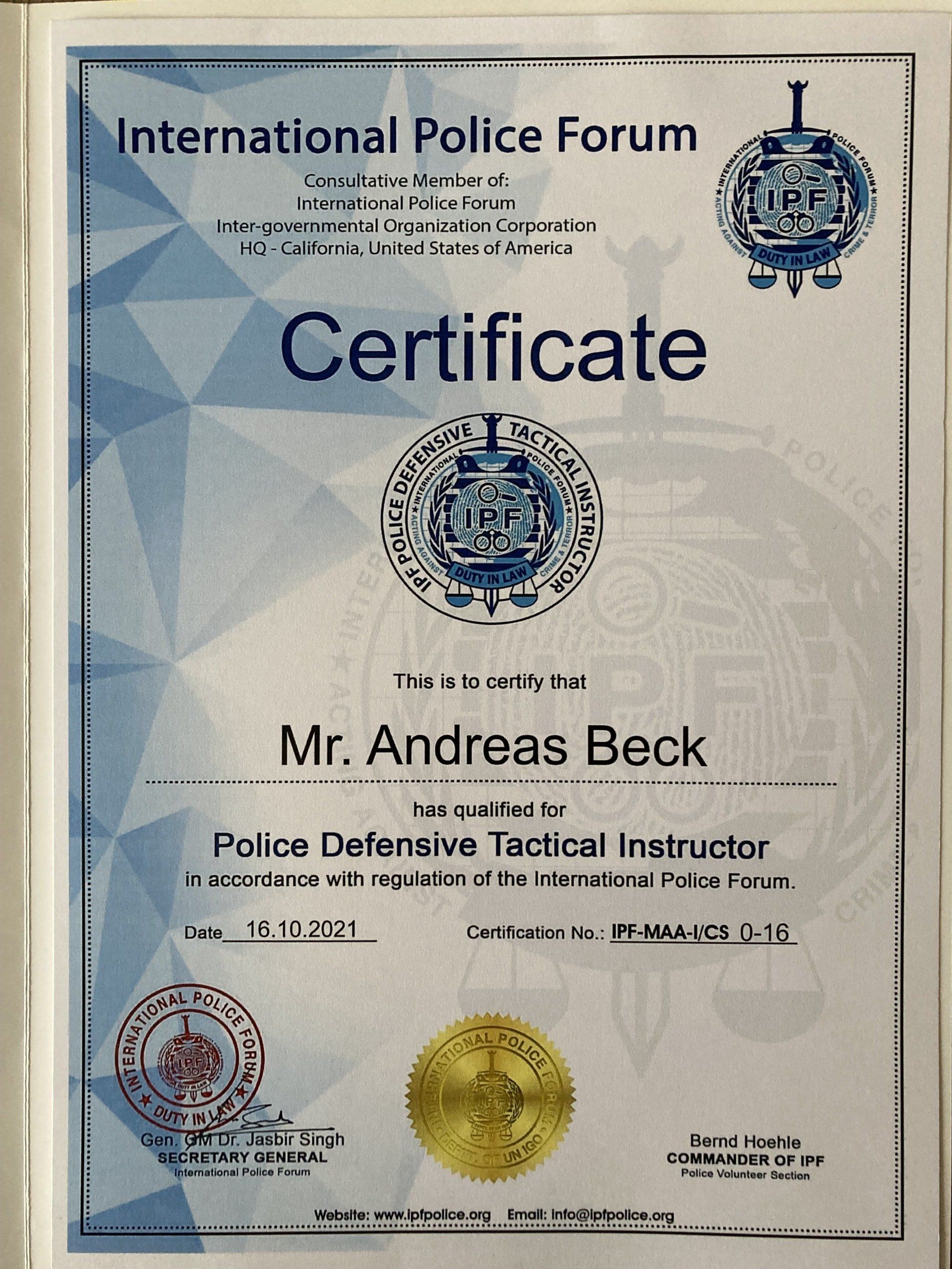 Wir sind Mitglied der IPF (International Police Forum), der größten Organisation für Polizei- und Sicherheitsdienstausbildung weltweit.